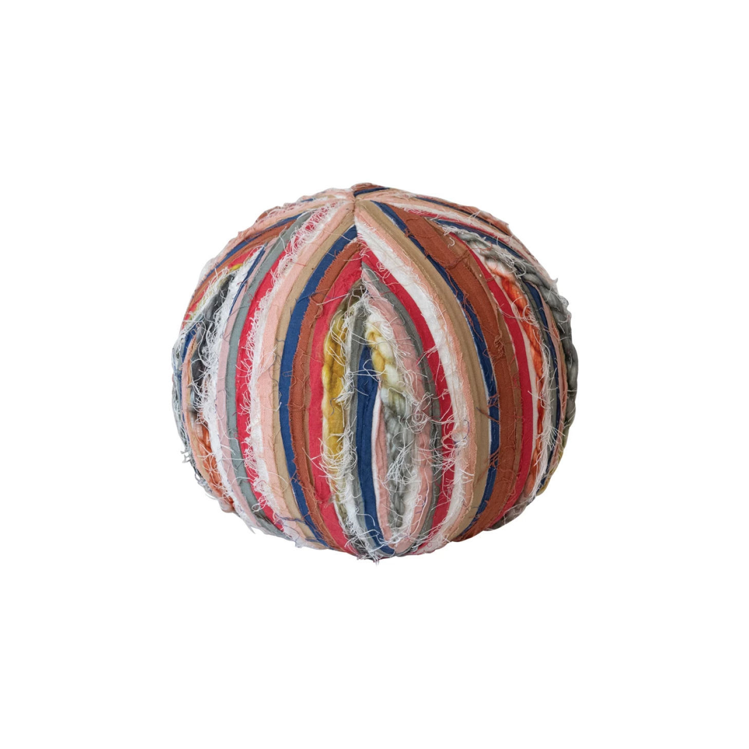 This woven cotton blend orb pillow with ripped fabric stripes, multi color is a fun and cozy addition to any space.