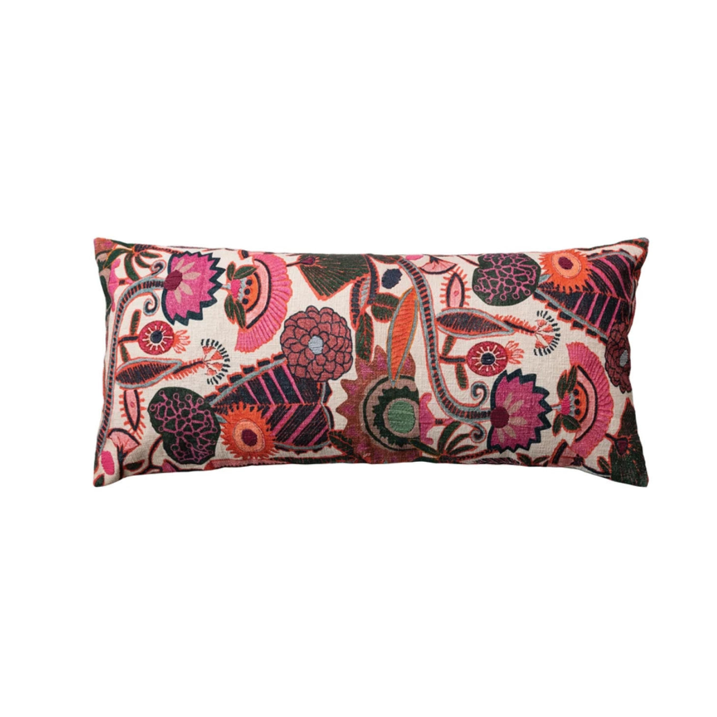 Multicolor Cotton Slub Embroidered Lumbar Pillow with Florals & Chambray Back