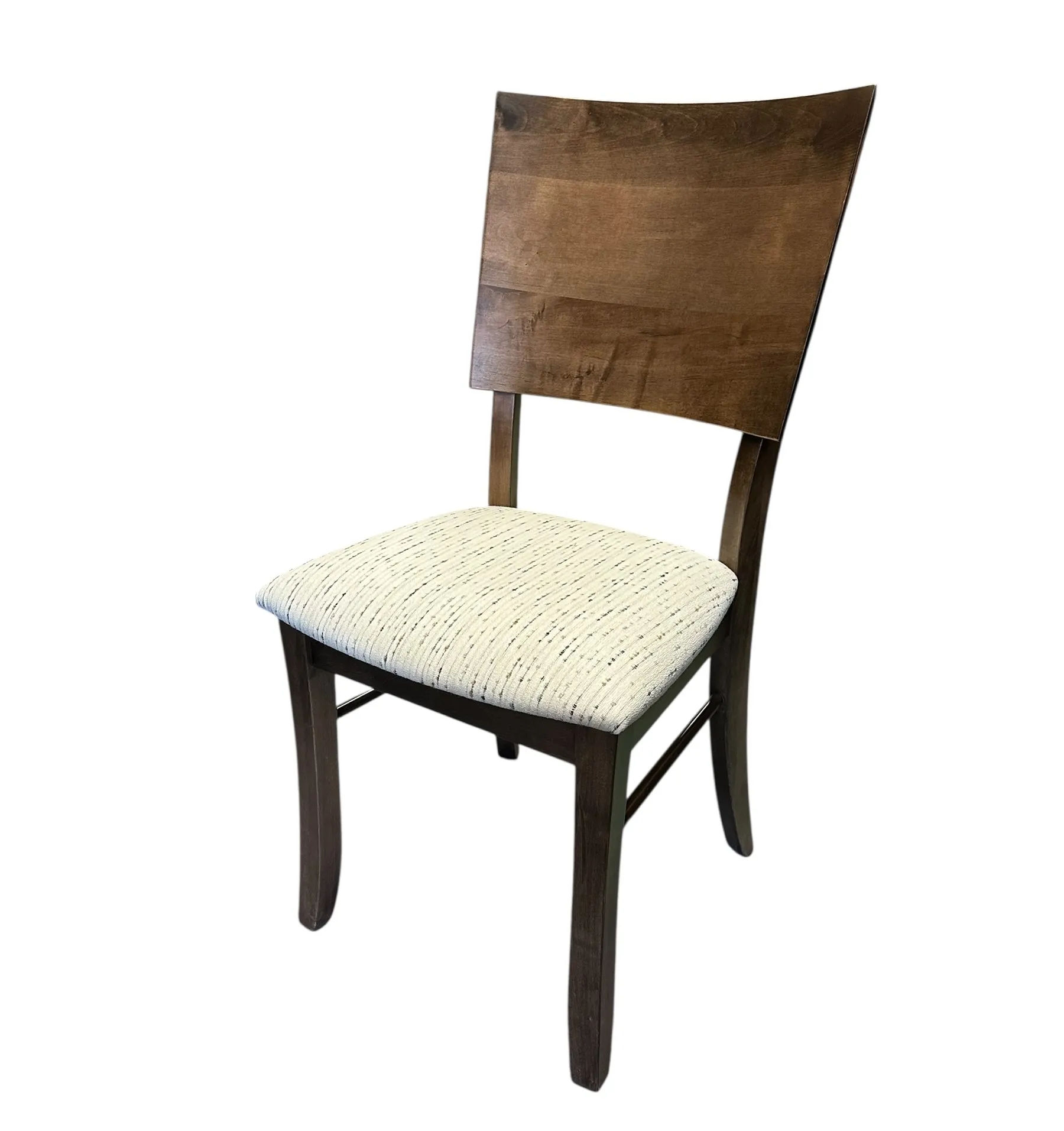 Sleek and modern, these panel back chairs are constructed of maple and are shown in our Cocoa stain, but you may choose from any of our finishes for your own custom look. Chair seats are comfortably contoured wood but can also be upholstered in the fabric of your choice. Slide these comfortable chairs up to a Cosmo table top with clean lines, add our Uptown buffet for storage and serving space and you have the makings of a modern dining room fit for a small space but impressive enough for a formal dining area.