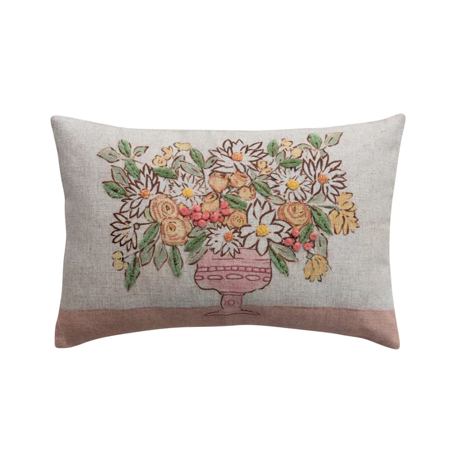 24"x16" Linen Blend Printed Lumbar Pillow with Flower Vase Embroidery, Pom Poms & Chambray Back