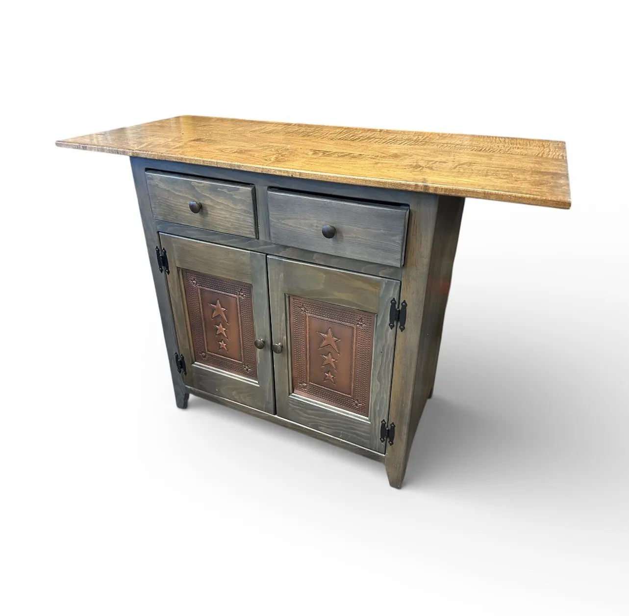 Rustic Stained Kitchen Island with 2 Copper Doors and 2 Drawers